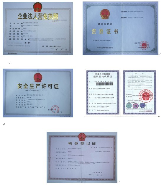 企業(yè)法人營(yíng)業(yè)執(zhí)照;資質(zhì)證書(shū);安全生產(chǎn)許可證;組織機(jī)構(gòu)代碼證;稅務(wù)登記證: