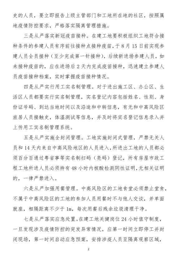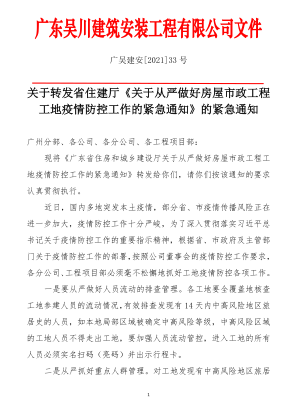 近期,國內(nèi)多地突發(fā)本土疫情,江蘇宿遷、湖北武漢等地建筑工地已出現(xiàn)新冠肺炎確診病例,疫情在工地傳播的風(fēng)險(xiǎn)進(jìn)一步加大。為深入貫徹落實(shí)習(xí)近平總書記關(guān)于疫情防控工作的重要指示精神,根據(jù)省委、省政府關(guān)于疫情防控的工作部署,按照全省疫情防控和安全生產(chǎn)電視電話會(huì)議要求,我廳決定在認(rèn)真執(zhí)行2020年2月印發(fā)的《廣東省房屋市政工程工地防控新冠肺炎疫情工作指引》的基礎(chǔ)上,對(duì)部分常態(tài)化疫情防控措施進(jìn)行提檔升級(jí),提出了以下9方面要求。請(qǐng)結(jié)合本地區(qū)工作實(shí)際認(rèn)真貫徹落實(shí),毫不松懈地抓好房屋市政工程工地疫情防控各項(xiàng)工作。